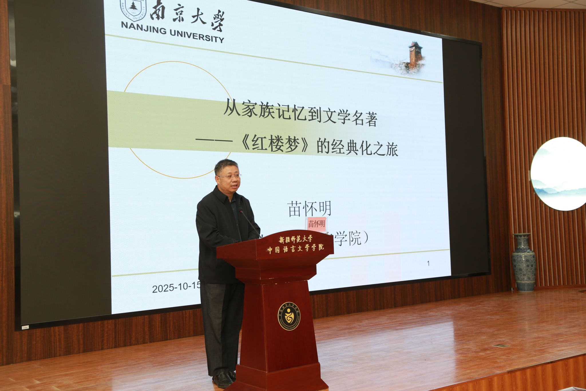 2025年10月15日下午,南京大学文学院苗怀明教授应邀在中国语言文学学院国学讲堂作题为《从家族记忆到文学名著--<红楼梦>的经典化之旅》的学术讲座。此次讲座由中国语言文学学院汉语言文学专业负责人魏娜副教授主持,学院师生代表到场聆听并展开学术交流。