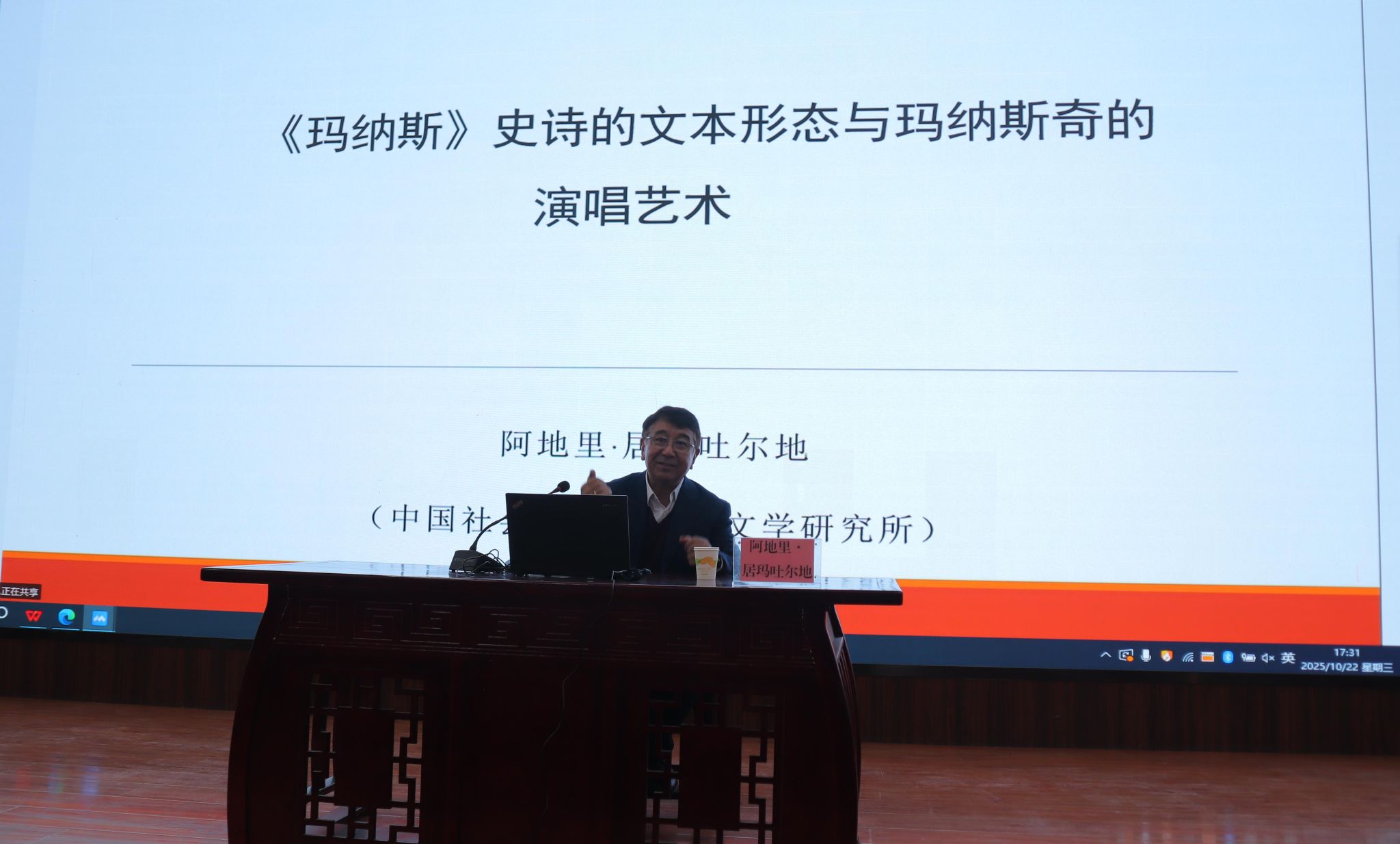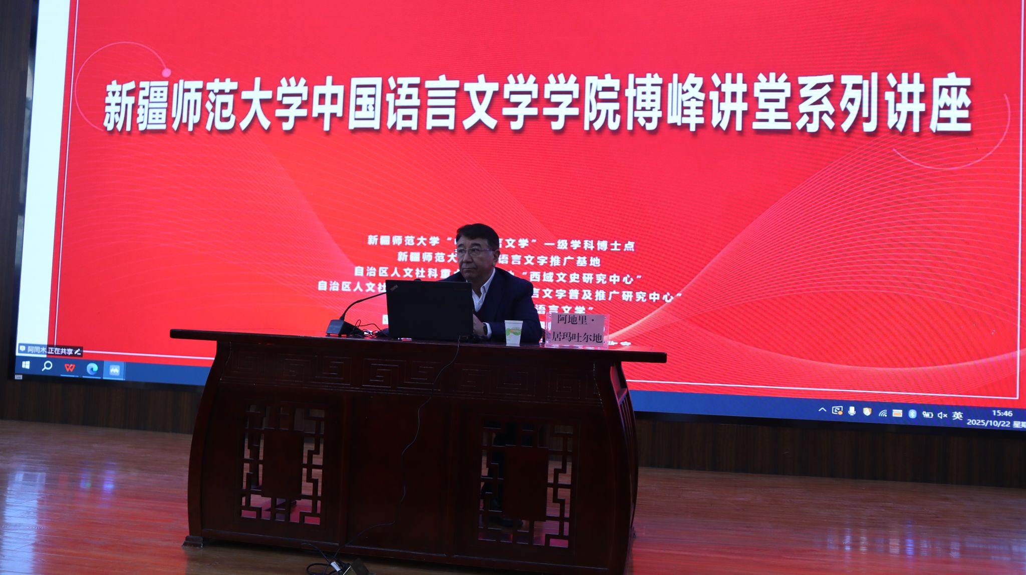 为加深对中华民族史诗传统的理解,推动非物质文化遗产的研究与保护,2025年10月22日下午,新疆师范大学中国语言文学学院在文科四号楼国学讲堂举办“《玛纳斯》史诗的文本形态与玛纳斯奇的演唱艺术”专题讲座。讲座特邀中国社会科学院二级研究员、中国社科院大学阿地里·居玛吐尔地教授为主讲人,夏国强副院长主持,学院师生代表共同参与。