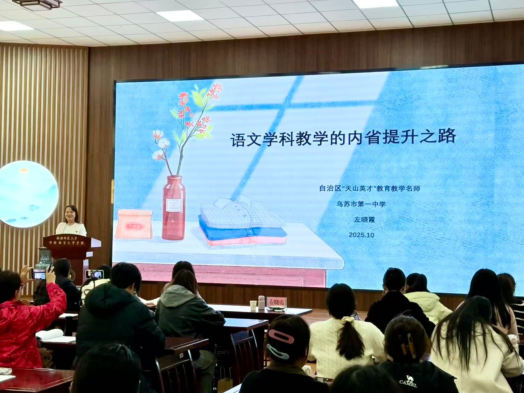 2025年10月25日下午,新疆师范大学中国语言文学学院“博峰讲堂系列报告(第一百八十期)”在文泽楼国学讲堂如期开讲。本次活动特邀自治区“天山英才”教育教学名师、乌苏市第一中学副校长左晓霞担任主讲。左晓霞老师以“语文学科教学的内省提升之路”为核心进行分享,中国语言文学学院80余名师生到场聆听。