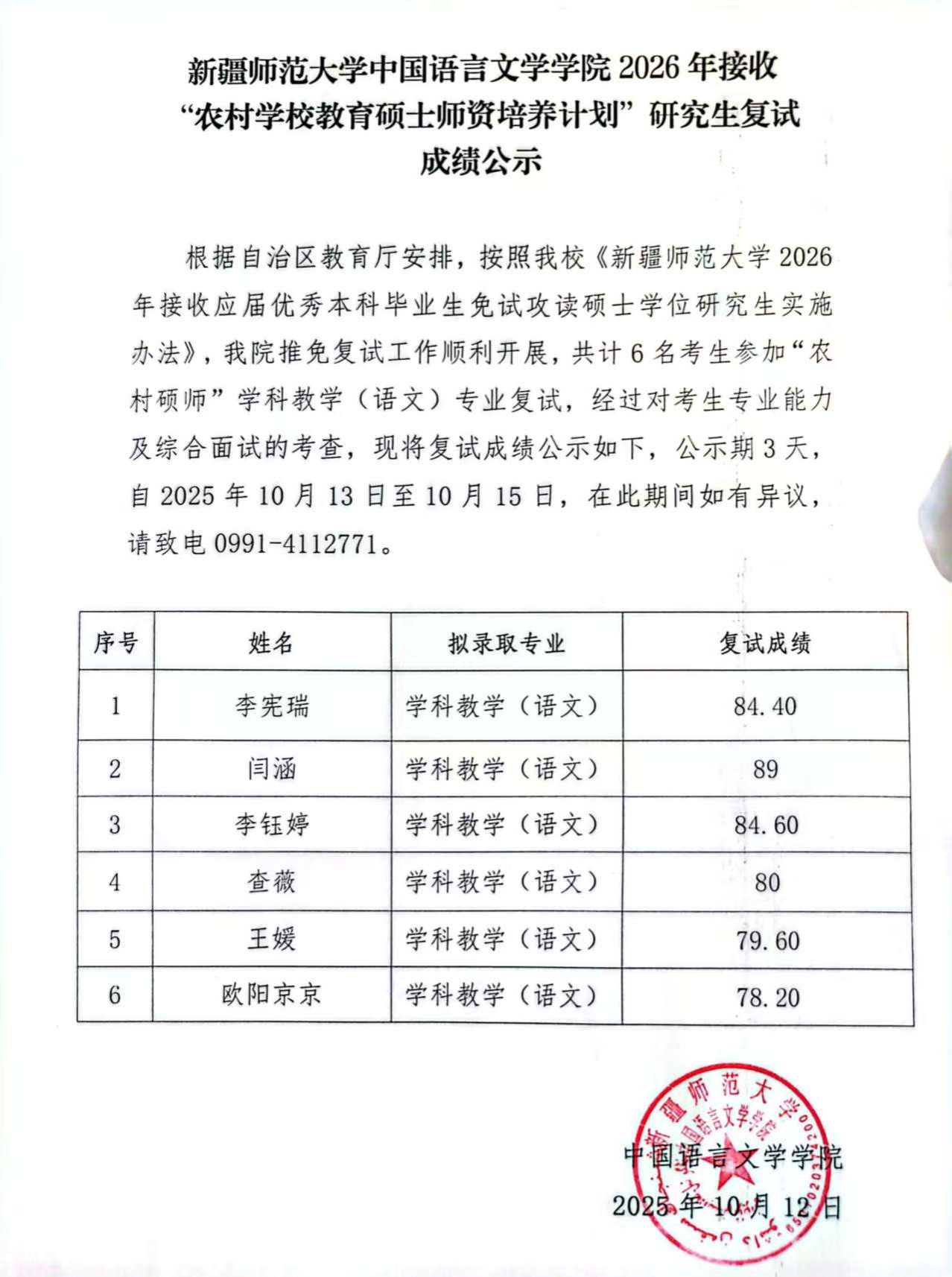 根据自治区教育厅安排,按照我校《新疆师范大学2026年接收应届优秀本科毕业生免试攻读硕士学位研究生实施办法》,我院推免复试工作顺利开展,共计6名考生参加“农村硕师”学科教学(语文)专业复试,经过对考生专业能力及综合面试的考查,现将复试成绩公示如下,公示期3天,自2025年10月13日至10月15日,在此期间如有异议,请致电0991-4112771。