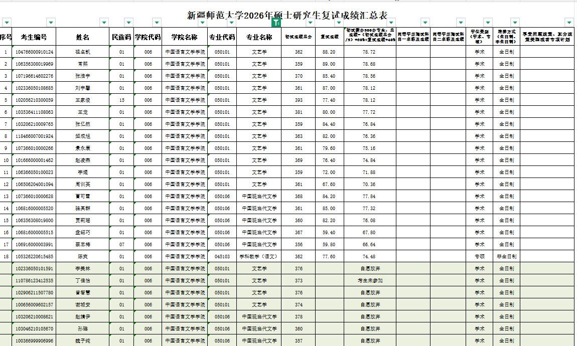 新疆师范大学中国语言文学学院2026年硕士研究生招生文艺学、中国现当代文学、学科教学(语文)非全日制专业一批次调剂复试工作已结束,现将成绩予以公示。公示期3天,自2026年4月12日至4月14日,在此期间如有异议,请致电0991-4112771。